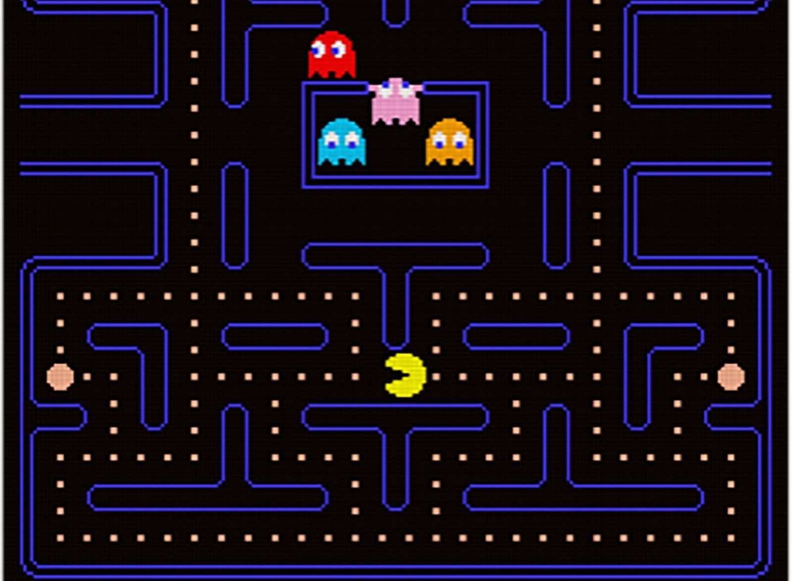 Pac-Man is a classic arcade game released by Namco in 1980. The player controls Pac-Man, a yellow, circular character who moves through a maze eating small dots (called pellets) while avoiding four colorful ghosts — Blinky, Pinky, Inky, and Clyde. The goal is to eat all the pellets in the maze to advance to the next level. Eating large flashing “power pellets” temporarily allows Pac-Man to chase and eat the ghosts for extra points.